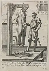 It was his hope that some Catholic nobles there would aid him, given his lineage. Finding none, he went to London, then back to Paris, and finally returned to Scotland in November 1613 disguised as a horse trader named John Watson. Thereafter he began to preach in secret, celebrating Mass clandestinely in private homes. This ministry was to last less than a year. In October 1614, Ogilvie was discovered and arrested in Glasgow under the orders of Archbishop Spottiswood, and was imprisoned. He was initially treated well, but after continually refusing to confess, was tortured by sleep deprivation. He aggravated his position by refusing to pledge allegiance to King James, and it was for this crime that he was tried. During the trial he accused the king of 'playing the runagate from God' and stated he would acknowledge him no more than an 'old hat'. Found guilty, he was hanged at Glasgow Cross on 10 March 1615, aged thirty-six.[3] The customary beheading and quartering were omitted owing to undisguised popular sympathy, and his body was hurriedly buried in the churchyard of Glasgow cathedral.[1]