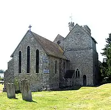 The chancel is 13th century or earlier with a 14th-century chapel on the south side and a late 11th or early 12th-century chapel on the north side. The external walls are buttressed and are of knapped or uncut flint with the chapel and tower walls also including pieces of tufa. The north chapel is converted from the lower two storeys of a tower, and has small windows on the east and north side with a 19th-century arched door on the east side. On the north-west corner of the north chapel is a stair turret to the upper floor. The south chapel has a three-lighted window on the south side. The east end of the chancel contains three tall lancet windows with the centre taller than the sides. The south wall contains a two-lighted window and the north wall a single lancet window and 15th-century window. The aisles have shallow lean-to roofs; the chapels are gabled.[1]