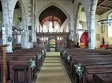 Internally, the aisles are divided from the nave with arcades of three pointed arches with octagonal columns and moulded capitals and bases; the arcade to the south is early 14th century and the one to the north late 14th century. The arcade on the south side continues between the chancel and the south chapel, with a single arch on the north side between the chancel and north chapel. The nave and flanking aisles are connected to the adjacent chancel and chapels with 14th-century arches. The north chapel has a 13th-century quadripartite vaulted on the ground floor with thick chamfered ribs springing from slender attached columns in the corners. The nave roof is restored 15th-century with crown posts and the aisle roofs feature moulded purlins. The chancel and south aisle roofs are 19th century.[1]