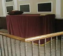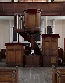 Inside, the most prominent features are these galleries, which form a rectangle and are held up on Egyptian-style iron columns,[3] and the large pulpit, which "towers over everything".[10][14] The layout and these fittings "represent a unique survival"[9] and a "superb example"[15] of a late Georgian style which was quite common in the early 19th century, particularly in Nonconformist chapels but also in Anglican churches with a Low church character.[9] The galleries are of American birch and are reached by staircases which have separate entrances in the single-storey wings to the side of the main entrance. Separate entrances were characteristic of churches of this era, which often required the sexes to sit apart; also, at St John the Evangelist's Church, the free pews (on the ground floor) were kept separate from those owned by the proprietors (in the galleries).[9][16] The pulpit stands centrally in the nave, hiding the small chancel and sanctuary.[15] It has been called the best surviving three-decker pulpit in Sussex.[17] An unusual refinement of the more common two-decker structure, a three-decker allowed different parts of the service to be read from different levels according to their importance. Responses to prayers were read from the lowest deck, usually by the church clerk. The main part of the service, including prayers, came from the middle deck; and the sermon—the most important part of a Low church service—took place in the circular upper deck.[17] The pulpit is free-standing on a fluted stem with a spiral motif.[10] Like the rest of the internal fittings, it is of American birch.[5][17] The three sections are now side by side, but originally they were aligned one in front of the other in a tiered formation.[17]