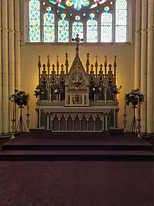 The cathedral angels (originally crafted by the Mattei Bros., of Melbourne) that used to stand either side of the high altar were restored by The Studio of Saint Philomena, and both placed back to their original positions. Their wings and the candelabra which the angels once held have had to be remade.[3] The wings, having not properly dried in time for the Solemn Mass were reunited with the angels on Gaudate Sunday.[4]