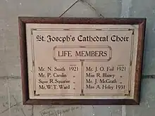 Raffaello Squarise was appointed honorary conductor and choirmaster in March 1891. On 18 August 1891, he was given a letter by the cathedral authorities stating ''a Catholic who figures prominently as a Freemason cannot consistently hold the position of Catholic Cathedral Choirmaster'', after he attended a Masonic installation the day prior.[14] Squarise went public via the Otago Daily Times with the letter he received, which caused more division between himself and Church authorities.[15][16] In January 1914,[17] he returned as conductor (during Vallis' tenureship as choirmaster and organist) and held the position with honour until 1921.[18] Squarise was elected as a life member of the choir in 1921, which a plaque roll of his name still in the choir loft shows today (pictured).