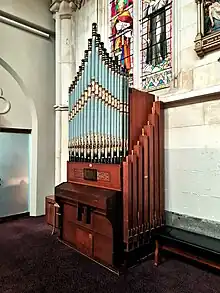 A second organ was obtained, installed and first used at the Mass of the Veneration of the Cross, on Good Friday, 2023. It has one manual and is a Casson's Patent, Opus 226, made by the Positive Organ Company Limited, London. The organ was originally housed in Holy Trinity Anglican Church, Lawrence, before finding itself in the collection of the New Zealand Organ Museum in Herbert. The plaque on the organ reads: "+ TO THE GLORY OF GOD + PRESENTED BY EDWARD HERBERT, IN LOVING MEMORY OF MAGDELENE, HIS WIFE. 15TH NOVEMBER 1897".
