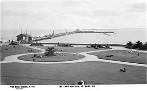 It was first built in 1853 as a small private timber jetty by the St Kilda Pier and Jetty company, but destroyed the same year, and rebuilt by 1855 as a public pier. It was extended many times, until it became a 1944 ft pier with stone groins. A shelter at the beach end, a breakwater and an L-shaped extension sheltering the St Kilda Yacht Club by the 1880s.[1] Moorings for the Port Phillip Bay excursion steamers were added in 1893, and the Pavilion was added in 1904. The pier became a favourite destination for promenading, fishing, excursions and small boat moorings for much of the 20th century, as St Kilda became Melbourne's entertainment district and most popular beach.
