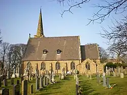 The church is constructed in sandstone rubble with slate roofs. Its plan consists of a four-bay nave, and a chancel at a lower level with a north organ chamber and a projection to the south.[2] There is a polygonal baptistry at the west end, and a slim tower and spire at the west end of the north side of the nave. The baptistry has three windows, and above this is a three-light west window with a pointed head. The nave is divided into bays by buttresses, each bay containing a two-light window containing Geometric tracery. Projecting from the roof, on each side, are two timber dormer windows. The tower has diagonal buttresses, and contains a doorway with a pointed arch. The bell openings have two lights, and are louvred. The tower is surmounted by a parapet and a recessed spire. The east window has five lights under a pointed head, and contains Geometric tracery. Inside the church is an open timber roof.[2] The two-manual pipe organ was made in 1872 by Henry Willis, and restored in 1974 by N. P. Mander.[6]