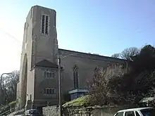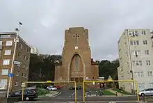 The church is part of a joint parish and benefice with St Ethelburga's Church in nearby Bulverhythe. This brown-brick building was designed in a simple Gothic Revival style in 1929 by John B. Mendham. A pinnacled Art Deco-style clock tower dominates the exterior.[16][34] The parish boundaries are the English Channel coast to the south; to the west, Glyne Gap and the western boundary of the borough, almost to the Crowhurst Road; to the northeast, the railway line between Crowhurst and West St Leonards railway stations; then behind West Hill Road, Archery Road, Quarry Hill, Kenilworth Road and Gensing Road.[35] The parish was reunited in 2009, 80 years after it was originally split to allow St Ethelburga's to become a separate parish church. The parish boundary had been Grosvenor Gardens.[36] The advowson (patronage) is held by the Hyndman's Trustees, based in Sheffield.[37]