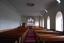 The church has a plain interior, its only adornment an early 20th century, three-panel stained glass window, decorated with images of the Crucifixion and the life of St Magnus. In the north and south walls are remnants of the earlier medieval church.[3] These include a narrow blocked round-arched door, a small, blocked lancet window in the north wall, and another blocked lancet window in the south wall.[1][2] There is also a late medieval font, made of red sandstone. The font's octagonal bowl is inscribed with a coat of arms. The graveyard surrounding the church contains several gravestones dating to the mid and late 18th century.[1]
