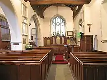 The church windows are of varying sizes and periods although mostly perpendicular in style. Over the doorway on the west side of the tower is a large rectangular three-lighted perpendicular window added in the 19th century. The windows to the nave, aisle and chapel are mainly two-lighted in design. Those to the south-east and east of the chancel and three-lighted. Internally, the nave and aisle are separated by a pair of wide plain arches and the chancel and chapel by a single arch.[1]