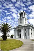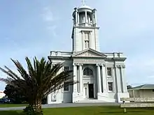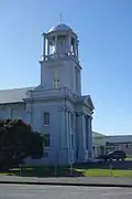 The 1866 church was demolished in February 1914. Bishop John Grimes laid the foundation stone on 23 March 1914. The new church occupied the site of the previous church, but with the entrance facing Sewell instead of Tancred Street. The nave of the church was first used on Christmas Eve in 1914. Owing to the outbreak of World War I and funding difficulties, it was not until 1920–21 that the portico and tower were added.[1] The portico is adorned with the Latin phrase Deiparae Virgini Mariae ("Mother Virgin Mary") and the abbreviation D.O.M., which refers to the Latin phrase Deo optimo maximo ("to the greatest and best God").[2]