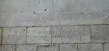 Below and on the same wall is inscribed a sketch thought to be of Old St Paul's Cathedral which burnt down in the Great Fire of London in 1666. This is the most important of the graffiti in St Mary's, not only because the depiction is of national importance but also because the mediaeval depiction of buildings in such detail is rare, even in manuscripts. The date the depiction was made was sometime in the 14th or 15th century. Architecturally, it shows a building in the Perpendicular style of about 1350 to 1500. It cannot be earlier than the masonry of St Mary's church which dates from about 1340, and if it actually does depict St Paul's it cannot be later that 1561, when the spire of St Paul's fell down.[8]