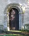 The west doorway dates from the middle of the 12th century, and was salvaged from the demolished All Saints’ Church in 1789. It is ornate. The arch proper has two orders, the inner one of which is embellished with continuous bobbin decoration on shafts and voussoirs. The outer order has its voussoirs embellished with standard beakheads, but the shafts have oddly stylized beakheads which become progressively narrower from bottom to top. The shaft capitals have thin volutes, except for the inner north one which seems to have small rosettes (the stone is weathered). The hood mould has an inner order of dog-tooth and an outer one of semi-circular incisions.[7]
