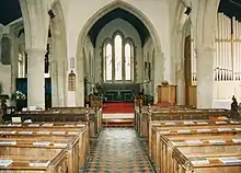 A pipe organ built by Norman and Beard of Norwich was installed in 1967. The organ had been built in 1916 for a church in London, which was bombed in the Second World War. In 2007 this was replaced because its restoration would cost more than a new instrument so a new electric organ was put in the church as part of the parish's Millennium 2 project.[8]
