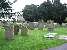 The parish churchyard of Hay is small; it is somewhat of a triangular shape, and was formerly bounded upon two sides by deep dingles or ravines; that on the east having a small stream flowing through it is called the Login. Some writers have supposed this ravine to have been originally used as a moat. The hollow on the west side of the churchyard was partially filled up at the time of rebuilding the church. In Hay churchyard (according a writer in 1886) may be found specimens of most of the quaint epitaphs commonly met with upon tombstones in rural churchyards, but none from their originality entitled to especial notice. Outside the north wall of the church is a walk composed of old tombstones removed there from the interior, where they had previously been used for paving the floor of the church. In 1886 it was described that several of these stones bore dates of the latter half of the eighteenth century, and one dated "1694."[2]