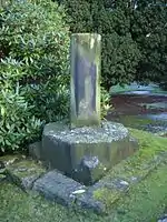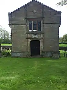 The mausoleum was built in 1909 by Edward Lyulph, 4th Lord Stanley. He died in 1925 and it contains his ashes and those of his wife, Mary Katherine, who died in 1929.[21] The mausoleum is built in ashlar buff and red sandstone with a Kerridge stone-slate roof. It was designed in the neo-Jacobean style by Paul Phipps, and is rectangular in shape, with two storeys and a three-bay north front. The central bay contains a door, above which is the Stanley crest, a three-light window and a date plaque in the gable. On the sides of the upper storey are three four-light windows. Inside the mausoleum is a white marble sarcophagus.[19] The yew tree in the churchyard is 1,200 years old.[22]