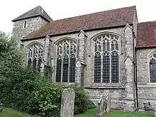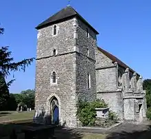 Construction of the church began in the 13th century – the square tower at the west end being the only part surviving from this period. The tower is built of roughly-coursed local ragstone and is topped with a pyramidal shingle-covered roof. It features lancet windows in the three outward-facing sides and a medieval doorway installed in 1858 that came from a demolished church at Teston.[1]