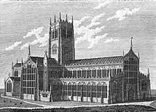 The church is mentioned in the Domesday Book of 1086[1] and is believed to date back to the Saxon times. The main body of the present building (at least the third on the site) dates from the end of the reign of Edward III (1377) to that of Henry VII (1485–1509). The nave was finished before 1475 and it is notable for its uniformity of gothic perpendicular style.[4] It is likely that the south aisle wall was the first part of the building to be constructed in the early 1380s, with the remainder of the nave and transepts being from the early 15th century.[5] The tower was completed in the reign of Henry VIII.[6]