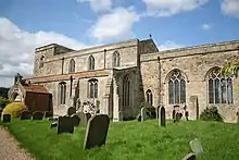 The church consists of a west tower of two stages, a four-bay aisled nave (with clerestory) entered through a south porch, and a three-bay chancel. The building material used throughout (except for the later south porch and aisle parapet, built of brick) is limestone in the form of cobble and ashlar. The earliest remains of previous churches on the site date to the 13th century, and are incorporated into the present structure. These include the arch between tower and nave, the eastern corners of the nave, and the western portion of the chancel. Above the tower arch is an asymmetrically set blocked doorway. But the majority of the work is from a rebuilding which occurred during the first half of the 14th century, i.e. entirely during the Decorated period, when aisles and a clerestory were added to the nave and the chancel was extended eastward. The tower was rebuilt during the 15th century, and the south porch during the 18th making use of the original south door.[1][2]
