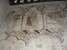 The oldest significant painting is a medallion at the east end of the south aisle. Uncovered in 1967 this has a central design of a cross in the form of an endless knot of rope. The south aisle also has 12th-century pictures of angels and Apostles.[5]