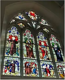 Inside the church, the high altar and reredos date from 1865, and were probably designed by E. W. Pugin. They were separated in 1948–50 by Weightman and Bullen, who placed the reredos against the east wall. The stained glass in the east window dates from 1878, and is a typical design by the Belgian stained glass painter Jean-Baptiste Capronnier.[3] The two-manual pipe organ was built by Franklin Lloyd in 1895, and is situated in a gallery on the north wall of the church at the west end.[6]