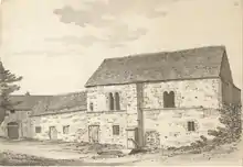 One of the most useful sources of information for the history of the Guildhall are the ink-wash drawings of Samuel Hieronymous Grimm, a Swiss artist who was extensively employed by the Dean of Lincoln, Sir Richard Kaye, mainly to record architectural subjects. Many of these drawings are in the British Library[17] but there are some of his drawings in the Usher Gallery in Lincoln. There are four drawings of the St Mary Guildhall, done about 1784. These include a view looking up the High Street with the Saxon Church of St Peter at Gowts in the foreground on the right and St Mary's Guildhall to the left. The stone house closest to the church with the chimney, together with the bay with the porch next to the Guildhall, were demolished in 1896 to make way for Sibthorp Street. There is another view in the Usher Gallery which is looking at the Guildhall from the opposite direction and provides more information about the houses to the south which were demolished.[18] Although these demolished houses contain Romanesque windows it is likely that they were rebuilt in the 17th century making use of earlier building material.