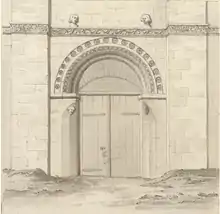 Grimm also provides a detailed drawing of the main entrance showing the orders of the arch studded with flowers and dogtooth ornament and two heads on the door jamb, one of which is a bishop. Above this is a running frieze with two heads above.