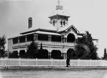 Standing to the south edge of the CBD of Warwick on the northern half of a one hectare block bounded by Palmerin and Percy Streets and Stewart Avenue, St Mary's Presbytery is a commanding presence in the neighbourhood. The presbytery is an integral part of the Warwick Catholic parish precinct which is spread across two adjacent town blocks and includes an imposing sandstone church, an earlier sandstone church now used as a parish hall, primary school and playgrounds, tennis and squash courts, a bowls club and residential apartments. The first floor verandah and belvedere of the presbytery afford sweeping views of Warwick and the surrounding district. There is a white painted timber fence across the block to the south of the presbytery separating it from the Southern Cross Bowls Club facilities (bowling green and associated structures) and lowset residential apartments which are not included in the heritage listing.[1]