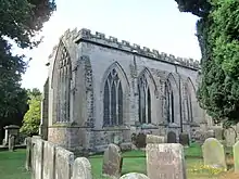 The chancel, of four bays, is late 13th-century; the pointed five-light east window and three-light side windows have intersecting tracery. The glass in the chancel is 14th-century.[1][3]