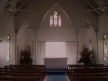 Internally, the ceiling is unlined and three lancet-shaped timber archways separate the sanctuary from the nave.[1]