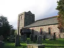 In the churchyard to the south of the church are three more Grade II listed buildings. The sundial is possibly the stump of a medieval churchyard cross.[6] The Atkinson monument consists of a headstone dated 1805.[7] Also to the south of the church is a group of four tombs dating from the late 18th and early 19th centuries.[8] There is a ring of 12 bells in the tower. Originally a ring of 8, they were augmented to 10 and later to 12.