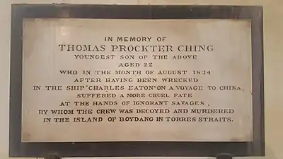 Memorial to Thomas Prockter Ching who served as midshipman on the ill fated Charles Eaton which was shipwrecked off Boydang Island in the Torres Straits.[3]