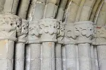 The nave is divided on either side into five arcades. They show the transition from Norman architecture to the Early English Style. The piers are Norman in character with foliated capitals from which spring pointed arches. The four clerestory windows on either side of the nave are examples of Early English lancets, whilst the two long lancets of the west wall are part of the nineteenth-century restoration.[4]
