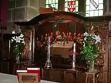 Inside the church is a west gallery carried on pairs of Doric columns. Many of the fittings were carved by Alec Miller in the 1910s. The choir stalls and the organ case are carved with angels playing a variety of instruments. On the vestry door is a carving of the Annunciation. The rood screen has depictions of saints, and carries a plain cross. The reredos includes a painting by James Cranke, and is flanked by carved figures of Virgin Mary and Saint Michael. The three-decker pulpit dates from the 18th century, and has a tester of 1912, which consists of a scallop carried by putti. The pews are decorated with roses and scallops. A larger pew, known as the Gale Pew, has carvings of putti and flowers. The font is medieval, and is in the shape of a large egg-cup. Its cover dates from 1921, and is carved with various items linked to the sea. Two of the windows on the south side of the chancel contain fragments of medieval stained glass. In the south wall of the nave is a window known as the Maiden's window, which was made in 1912–13, and a window of 1931 depicting Doubting Thomas, made by Powells. Also in the church is a 13th-century coffin lid inscribed with a foliated cross, and memorial wall tablets dating from the 18th and 19th centuries.[4] The two-manual pipe organ is located on the north side of the chancel, and was built by Wilkinson of Kendal in about 1910.[5] There is a ring of six bells, the oldest of which dates from about 1460. The next was cast in 1711 by Abraham Rudhall II of Gloucester. The other bells were both cast by John Taylor and Company of Loughborough, one in 1907. and the other in 1955.Two further bells have been added, The Four Sisters and The Centenary Bell both cast by John Taylor & Co.[6]