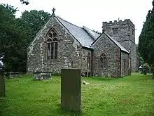 The church is constructed in stone rubble with ashlar dressings and a slate roof. Its plan consists of a four-bay nave with a south porch, a chancel with a north vestry, and a west tower. The tower is as wide as the nave, and has a west doorway with a pointed arch. Above the doorway is a three-light window with Perpendicular tracery and a niche containing a sculpture of the Pietà. The three-light bell openings have louvres and straight heads. At the top of the tower is an embattled parapet.[3] The walls of the tower are very thick, and contain a stairway inside the north wall.[4] On the south side of the nave is a gabled porch with a round-headed doorway, over which is a quatrefoil. To the right of the porch are two-light Decorated windows, and a two-light mullioned window. On the north side are two-light straight-headed windows. The east window of the chancel has three lights. On the south side of the chancel are a lancet window, and a two-light Decorated window, and on the north side is a two-light Perpendicular window. The vestry has two-light windows on the east and west sides.[3]