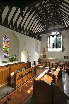 Inside the church, the wooden pulpit is Jacobean, dating from about 1610. It has a back panel and a sounding board.[8] The "splendid" and unusual fitting contrasts with the simplicity of the surrounding Norman architecture.[4] The font dates from the 14th century, and consists of plain square bowl supported by a central column and four corner shafts. In the chancel are two square-headed aumbries, and set in the north chancel wall is a weathered piece of sculpture dating from the 11th or 13th century; this was moved from the outside of the church in 1948. On the north wall of the nave are the remains of a 17th-century painted inscription, and on the south wall is a painted panel bearing the Royal arms of Queen Victoria.[9] An Elizabethan-era monument with Classical-style details stands in the south aisle.[5][10] An unusual feature from the church's earliest days is a set of inward-facing stone seats attached to the inner walls of the chancel. Such benches were often found in 11th-century churches, albeit usually in the nave, but in most cases they were removed during later rebuilding work.[5][14]