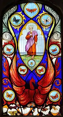 During the 13th century a north chapel or transept was added towards the east end of the nave, and a two-bay south aisle was built.[8][9] The aisle had the appearance of a transept and was separated from the body of the church by a two-bay arcade.[3][10] In the following century the nave was rebuilt.[2] The north porch was added, and the east window was inserted, during the 15th century.[8][10] Around the same time, diagonal buttresses were added at the east end—possibly because the insertion of new windows in the chancel had weakened the walls.[4][10] In 1882–83 the church was restored by the Lancaster architects Paley and Austin. They replaced the two-bay south aisle with a full-length aisle, removed the west gallery, and added new floors, an altar with altar rails, stalls, a lectern, and a reading desk, and reseated the church.[11] They also repaired the north transept and added the "elaborate" chancel arch.[5] The restoration cost £1,790 (equivalent to £190,000 as of 2021).[9][12][lower-alpha 1] In 2002 the north transept, by then in use as a vestry, was severely damaged by a fire and the organ was destroyed. The damage was repaired and the church was rededicated in 2004.[8] A well-regarded stained glass window depicting British butterflies and bees,[4] badly damaged by the fire, was replaced by a new design which kept the same theme but added images of Saint Peter and a phoenix rising from a fire.[2]