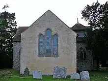 A church here was mentioned at the time of the Domesday Book of 1086. It is likely to have been a Saxon wooden church. Later in the 11th century the present nave may have been built over its foundations.[4] The tall, wide structure has a single window on each side (north and south), and lacks side aisles.[5][6] The next addition was a mid 13th-century Early English Gothic chancel; its north and south lancet windows[5] give an indication of how church windows had developed since Norman times.[7] In about 1290 the building was made cruciform by the addition of north and south transepts.[7][8] That on the north side was built so it could bear a tower, but this addition was never made.[7] Instead a belfry was added, "astonishingly situated astride the ridge" of its roof according to Nikolaus Pevsner.[5] The transept wings have windows with Decorated Gothic tracery, showing a further evolution in window design.[9] Also in about 1290 the church was given some small stained glass windows depicting the Coronation of the Virgin.[8] This represents a very early example by Sussex standards, dating from a period when stained glasswork was moving from the grisaille style and the basic Tree of Jesse towards Biblical figures.[10]
