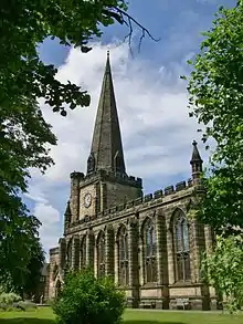 St Mary the Virgin's Church, Uttoxeter, commonly called simply St Mary's, is the parish church of the town of Uttoxeter, Staffordshire, England.[3] Its tower and spire were built in the 14th-century; the nave was rebuilt in 1828 and the chancel in 1877. It is a Grade II* listed building.[1]