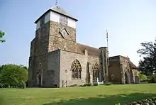 The nave is adjoined by aisles on the north and south sides, the one to the south continuing across the south face of the west tower. The chancel has chapels on the north and south side. The tower was built in the 13th or early 14th century and comprises three stone-built stages with a fourth stage, containing the belfry added later in white painted weatherboarding with a pyramidal roof. Louvred openings occupy the centre of each side of the belfry. Small rectangular or pointed lancet windows pierce the stonework on each external face of the lower stages, except the south face which abuts the south aisle. A square stair turret with window slits adjoins the north-west corner of the tower.[1]