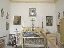 The chapel has one stone altar and three pictures depicting Saint Lucy, Saint Nicholas and St Rita of Cascia. There are also a set of Via crucis. the chapel's ceiling has a number of round arches which support the roof.