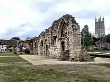 However, the priory soon declined into obscurity. Late in the reign of King Cnut its estates were used as an endowment for a royal clerk. In 1089 Serlo, the Norman abbot of the original St Peter's, began an ambitious new church (later Gloucester Cathedral) to replace the old minster, and St Oswald's, its emoluments much reduced, became a minor house of Augustinian canons.[7] The monastery was suppressed in 1536, and became the parish church of St Catherine, but this was destroyed in a Civil War siege in 1643.[2]