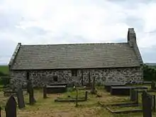 Chevron-carved voussoirs (wedges) and three stone human heads, weathered by time and also probably from the 12th century, have been repositioned over the doorway, which is at the west end of the south side of the church.[2][7] The wedges probably come from a former chancel arch and apse, removed (as in other churches in Anglesey) to make the chancel larger.[6] The doorway has been enlarged at some point, most likely during the early part of the 19th century. On the north side, a doorway was added in the 18th century, but it was subsequently blocked and a window inserted instead.[2] One writer has speculated that this might have been a leper niche and window.[4] There are two other modern windows in the north wall, and all three are at different heights.[2] There is a bellcote at the west end, housing a bell (probably from the 18th century).[7] The roof has been described as being "clearly one of the earliest on the island".[6]