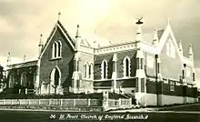 The first Church of England services in Ipswich were held in a timber building in Ellenborough Street. A brick church was then erected in 1850 on the corner of Brisbane and Nicholas Streets, opposite the present-day church. This was always intended to be a temporary building and was later used as a Sunday School and day school; it was demolished in 1877.[1]