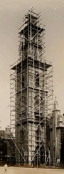 It is in the Georgian Portland Square. It was designed by Daniel Hague although the original St Paul's Church was to be designed by James Allen in a Greek style. Work was started on the church in 1789 and completed in 1794. St Paul's became known as the Wedding Cake Church from the unusual tiered tower.[2] The tower was designed to hold a ring of ten bells, however only four bells were purchased, all cast by John Rudhall of Gloucester, two in 1792 and the 6th and tenor bells of the proposed ring in 1795.[3] The tenor bell is still hung for full-circle ringing,[4] and the other bells were removed and are now hung in other churches - the two smaller bells are now at St Michael's, Buckland Dinham and St. John's, Wagga Wagga, and the second largest is now the tenor bell at St. James', Sydney.[5]