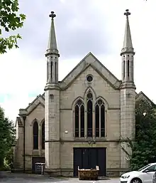 The former church is constructed in sandstone with a tiled roof. Its architectural style is Early English. The plan consists of a seven-bay nave with full-height aisles, a two-bay chancel and offices. It has a three-span roof. The west end is in three sections; the central section is gabled, and the side sections are smaller with angle buttresses. Octagonal turrets rise at the junctions of the sections. In the lower part of the central section is a three-bay arcade, each arch containing a window. Above the arcade are three stepped lancet windows, over which is a small circular window. The turrets are slim and contain open arcading, and an embattled cap over which is a tall pinnacle with a quatrefoil finial. Each side section contains a tall lancet window. Along the side of the church, the bays are divided by buttresses. The first bays contain a doorway with a window above it, and all the other bays have pairs of lancet windows. At the east end of the church are three stepped lancet windows and pinnacles similar to those at the west end.[1]