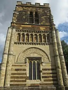 The tower is in three stages with a battlemented parapet. There are buttresses at the western corners. In the bottom stage of the west face is a three-light square-headed window, over which is the arch of the original west doorway. This is round-headed and consists of three orders of archivolts with carved voussoirs. In the middle stage are round-headed blind arcades. The west face has a single arcade of eight arches. On the north face are two tiers of arcades, each containing seven arches. The upper tier also includes a clock face. The south face also has two tiers, the upper tier having eight arches, and the lower tier with six arches. On each side of the top stage is a two-light louvered bell opening.[3]
