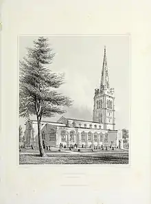 Little is known of the origins of the church, its first known priest becoming rector in 1219–20. The chancel is in the Early Decorated style of about 1300, the main fabric of the building being mostly Perpendicular, having been rebuilt in the mid 15th century. The crocketed spire reaches a height of 179 feet (55 metres).[4]