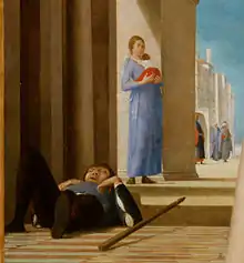 The visit of the Sicilian artist Antonello da Messina to Venice in 1475–1476 has traditionally been seen as turning point in the history of the city's painting – Giorgio Vasari crediting him with introducing oil painting to Venice. Antonello painted two altarpieces for Venetian churches, one for the church of San Cassiano, and the other, of which the St Sebastian once formed part, for the altar of the Scuola di San Rocca in the parish church of San Giuliano. It has often been assumed to have been painted in Venice in 1476, but it may have been painted only after Antonello's return to Sicily in the autumn of that year.[1] A description by Francesco Sansovino, dating from 1581, indicates that the altarpiece consisted of a wooden statue of St Roche, flanked by painted panels showing St Christopher and St Sebastian. Sansovino describes the panel of St Christopher as being by Antonello, and that of St Sebastian as being by "Pino da Messina" (i.e. his son Jacobello or "Jacopino"). However art historians have generally accepted Antonello's authorship of the St Sebastian. The statue and the painting of St Christopher are now lost.[2][3]