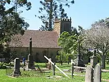 A cemetery on this site dates from 1859.[11] A white weatherboard house, formerly the early church is at the rear of the stone church (from a 1903 photograph). This was still extant in 1963.[12] The area to the rear of the 1876 church contains a small toilet block, the remains of an early cemetery on the site and a tree line which is set out as an indicative eastern boundary to the burials. The evident cemetery monuments are restricted to the western side of the rear allotment with both marble and sandstone stelae represented. Historical evidence from the 1860 cemetery regulations suggests that they were purposefully set out from the south and along the western boundary from an early period.[1]