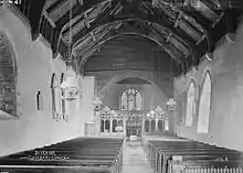 Inside the church is the original Norman west doorway of the nave; this was formerly on the exterior of the church, but now leads into the tower. Above this is a 12th-century window.[2] The roof of the nave has been dated by dendrochronology to 1494–95. In the south wall of the nave is a trefoil-headed piscina, in a position corresponding to the external tomb recess. The font dates from the 12th century. There is stained glass in the east window and in some of the nave windows by Hardman, and in one window in the south wall of the nave is a window dated 1920 by Kempe and Company.[3] There are separate war memorial plaques to the parish dead of the two World Wars, a slate plaque to Lieutenant Edward Whitehead (killed in First Gulf War 1991), and a prayer desk given in memory of Robert Henry Cooper and his comrades who were killed in World War II in the sinking by enemy action of MV Siamese Prince.[4] In 2021 a five year long project financed by a legacy and grants led to the conversion of a disused vestry to provide the church with a toilet, kitchenette and an internal spiral staircase to give access to the belfry for ringers.[5]