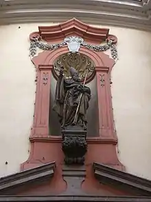 After a fire caused by a lightning strike, the church was rebuilt in 1725 in baroque style, according to a design by Kilian Ignaz Dientzenhofer. It features a dome on top of the nave and a bell tower topped with slender spire on the front facade of the structure.[5] To save expense, Dientzenhofer retained the Renaissance portals. Kohl carved a statue of St. Augustine for the niche above the main portal.